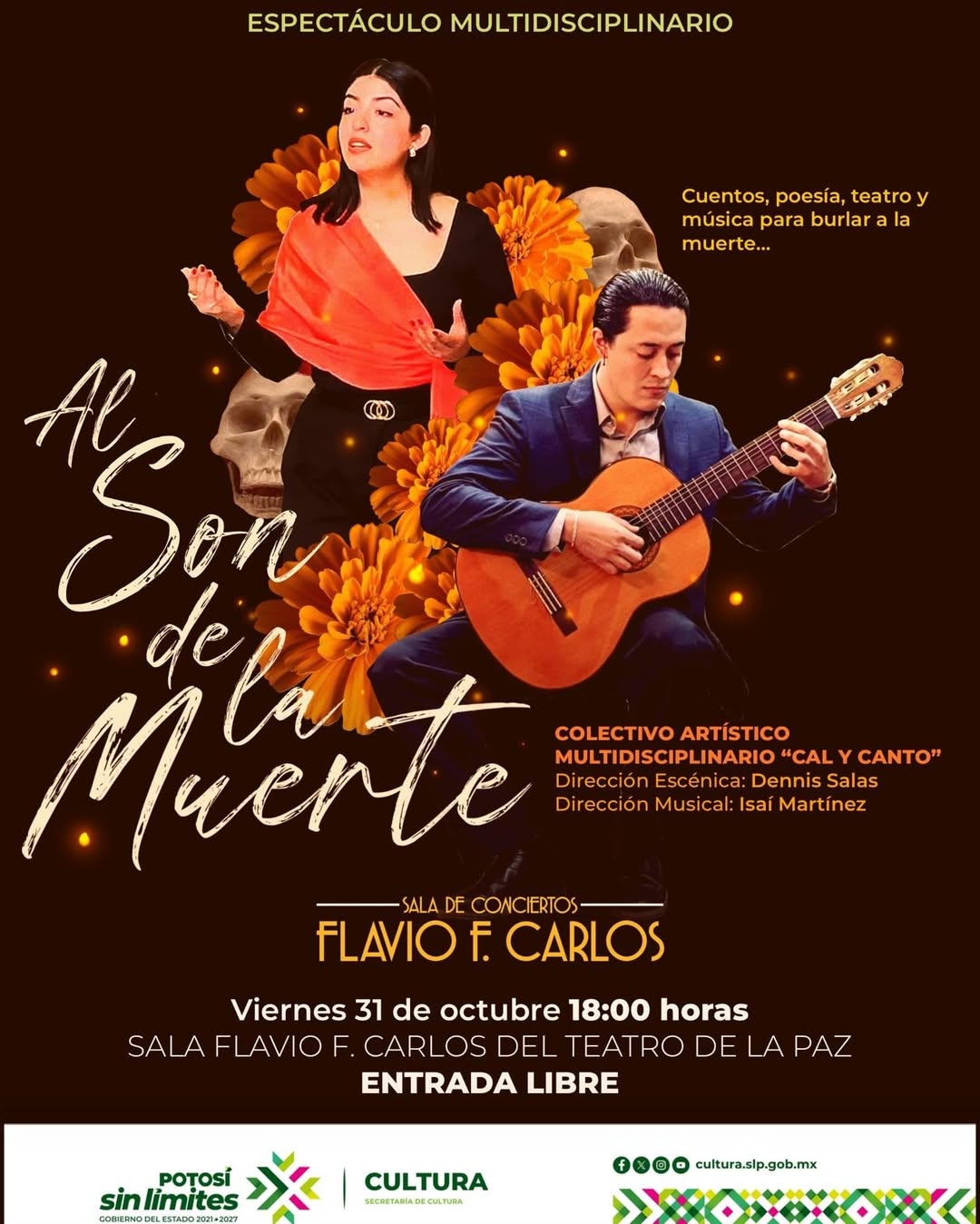 La Secretaría de Cultura del Gobierno del Estado invita al público potosino a disfrutar “Al Son de la Muerte”, un espectáculo multidisciplinario que reúne cuentos, poesía, teatro y música en una puesta en escena que celebra nuestras tradiciones y el talento local.