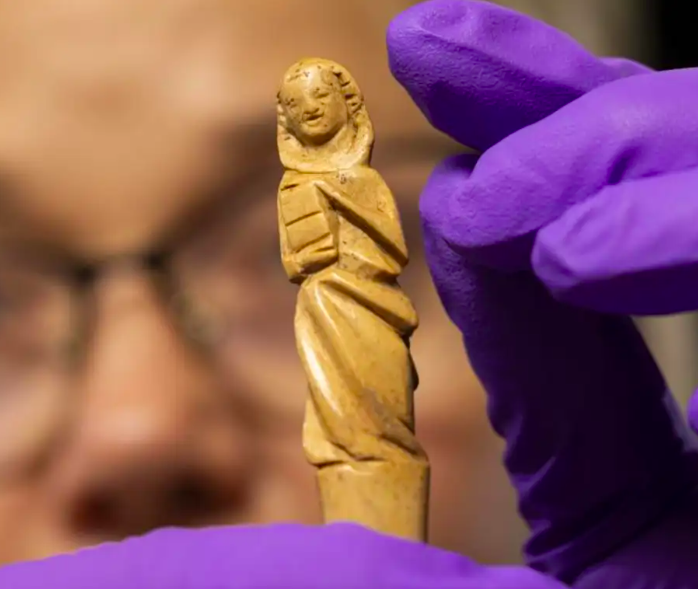 Lo más llamativo del gravoir es su decoración: una figura con capucha que sostiene un libro, evocando las modas de las cortes europeas medievales, especialmente francesas. Esto sugiere que, aunque fue elaborado con materiales locales, estuvo inspirado en tendencias continentales, lo que lo convierte en una pieza de “alta costura medieval”.