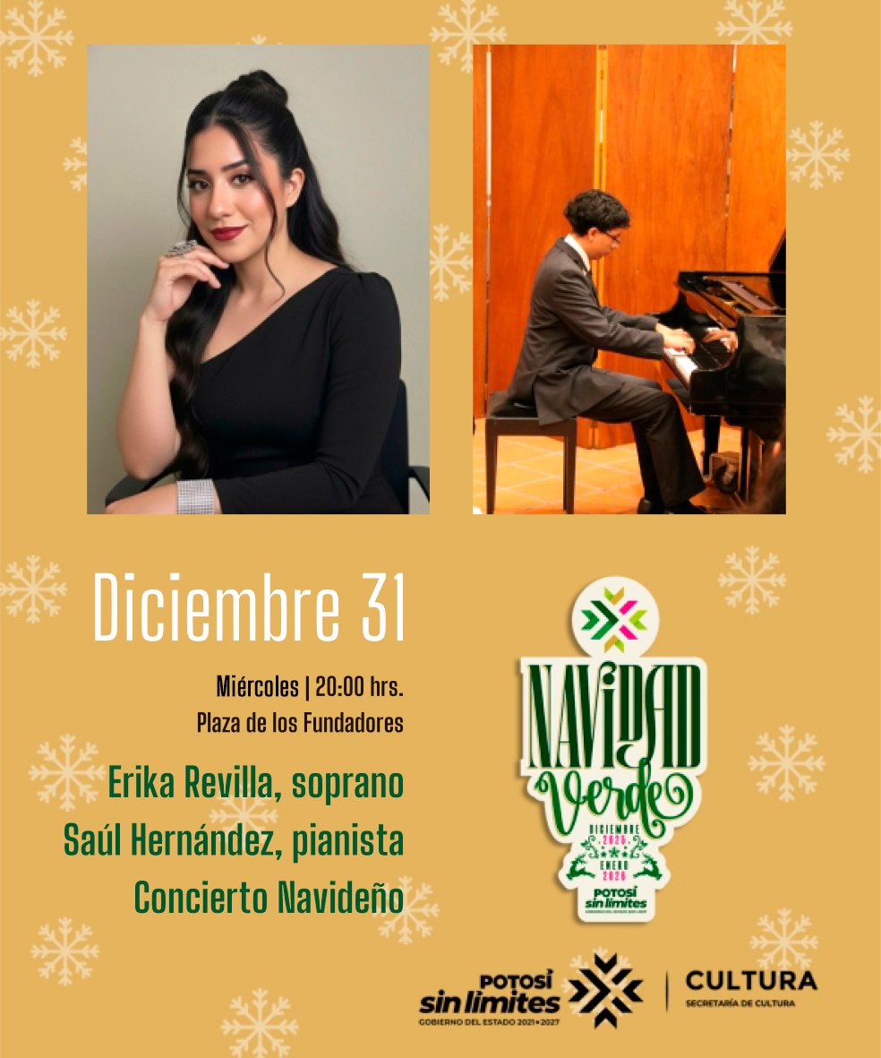 Como parte de las actividades del Programa Navideño 2025, este lunes se llevará a cabo un concierto especial para despedir el año con la participación de la cantante Érika Revilla y el pianista Saúl Hernández, quienes prometen una velada llena de música, tradición y espíritu navideño.