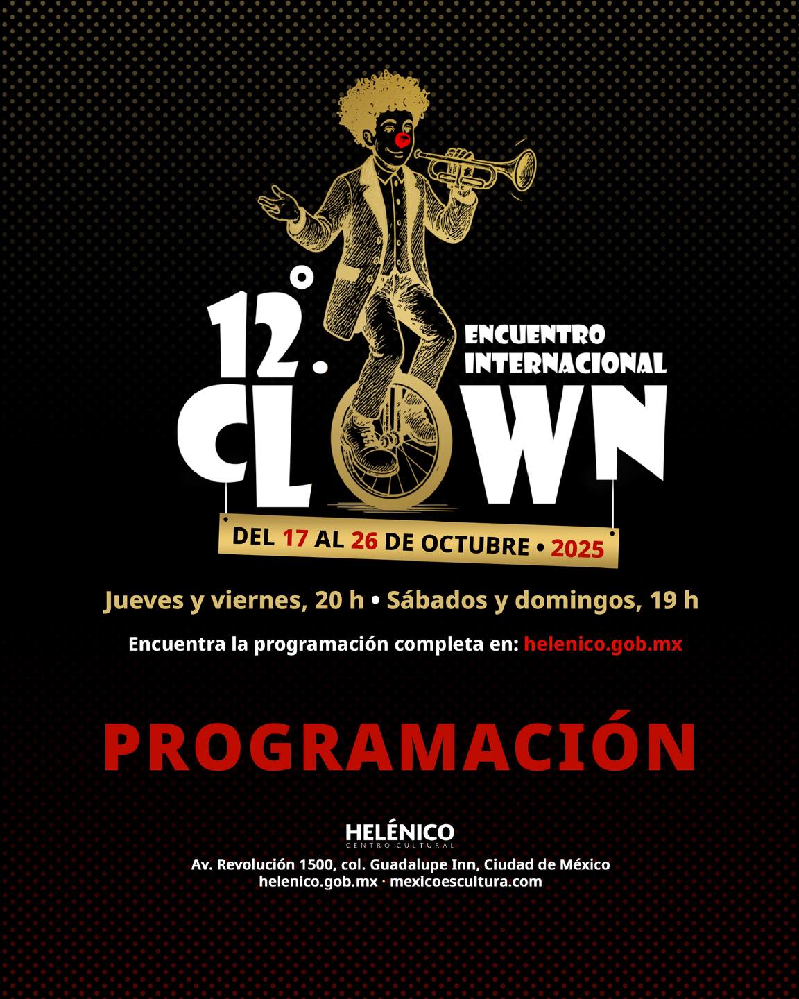 El Encuentro Internacional de Clown se llevará a cabo hasta el 26 de octubre de 2025 en el Centro Cultural Helénico, uno de los espacios más emblemáticos para las artes escénicas en la Ciudad de México.