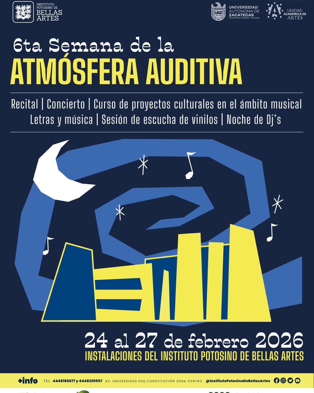 El Instituto Potosino de Bellas Artes (IPBA) alista la 6ª Semana de la Atmósfera Auditiva, que se llevará a cabo del 24 al 27 de febrero de 2026 en sus instalaciones, con una programación dedicada a la exploración sonora y musical.