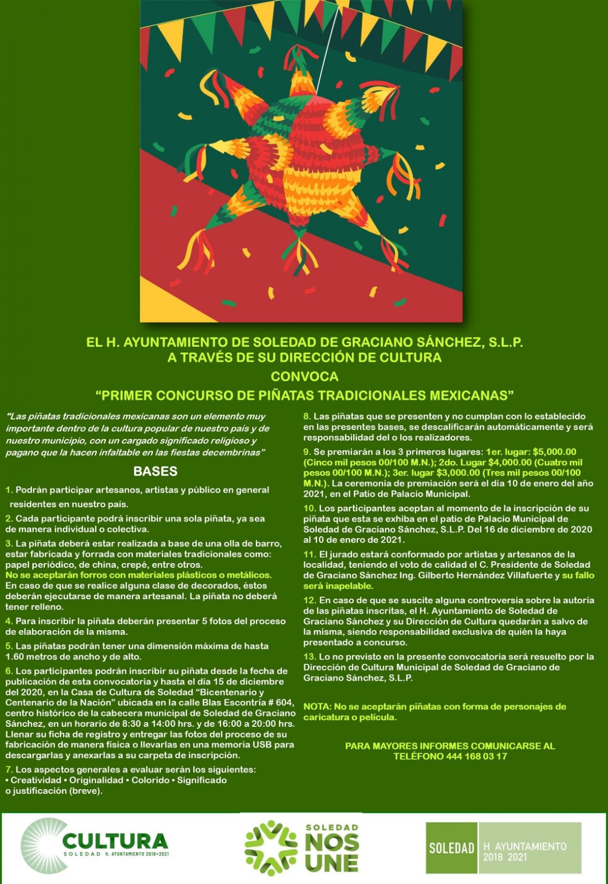 El Ayuntamiento de Soledad, a través de la dirección de Cultura Municipal, continúa con la invitación para participar en el concurso de piñatas tradicionales, las cuales, tras su recepción, serán exhibidas en el Palacio Municipal.