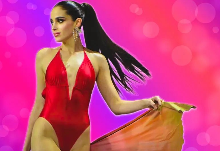 Con un traje completo en tono rojo escarlata, corte halter y escote pronunciado, Fátima destacó por su porte y seguridad. Las luces del escenario hicieron resaltar la textura brillante de la prenda, mientras que su peinado —una coleta alta complementada con extensiones— acentuó el movimiento de su silueta. Para completar el look, eligió plataformas en tono nude y un pareo naranja que usó con naturalidad al girar en su pose final.