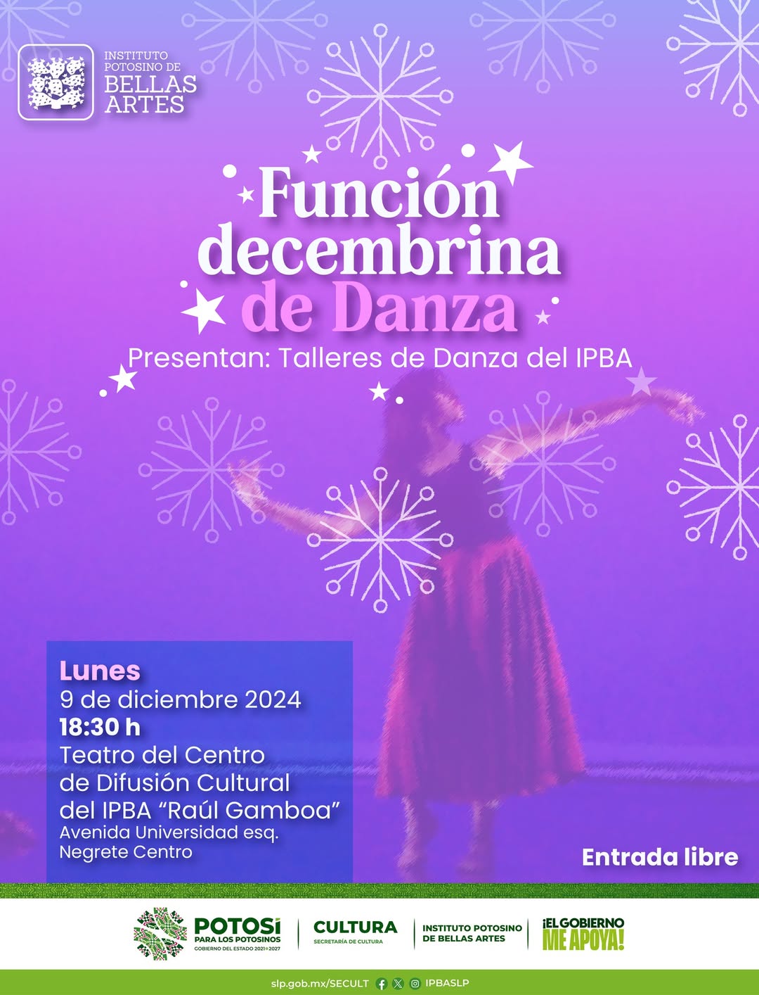 El Instituto Potosino de Bellas Artes te invita al show «Función decembrina de danza», un evento realizado por del alumnos y alumnas del área de danza del recinto cultural.