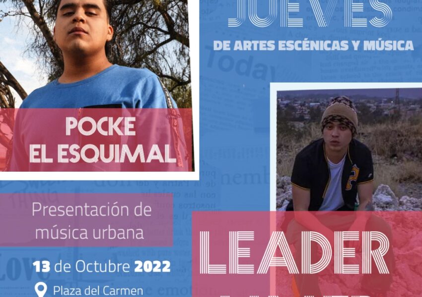 La Dirección de Cultura Municipal mantiene el apoyo y difusión de los artistas locales e independientes en las diferentes disciplinas, y como parte del programa Jueves de Artes Escénicas y Música, este 13 de octubre a las 19:30 horas en la Plaza del Carmen se presentan los músicos del género urbano “Leader Limer” y “Pocke El Esquimal”.
