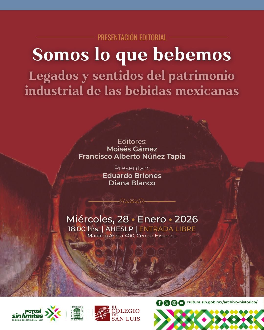 La Secretaría de Cultura de San Luis Potosí invita al público a la presentación editorial del libro Somos lo que bebemos. Legados y sentidos del patrimonio industrial de las bebidas mexicanas, una obra que reflexiona sobre la historia, los significados culturales y el valor patrimonial de la industria de las bebidas en México.