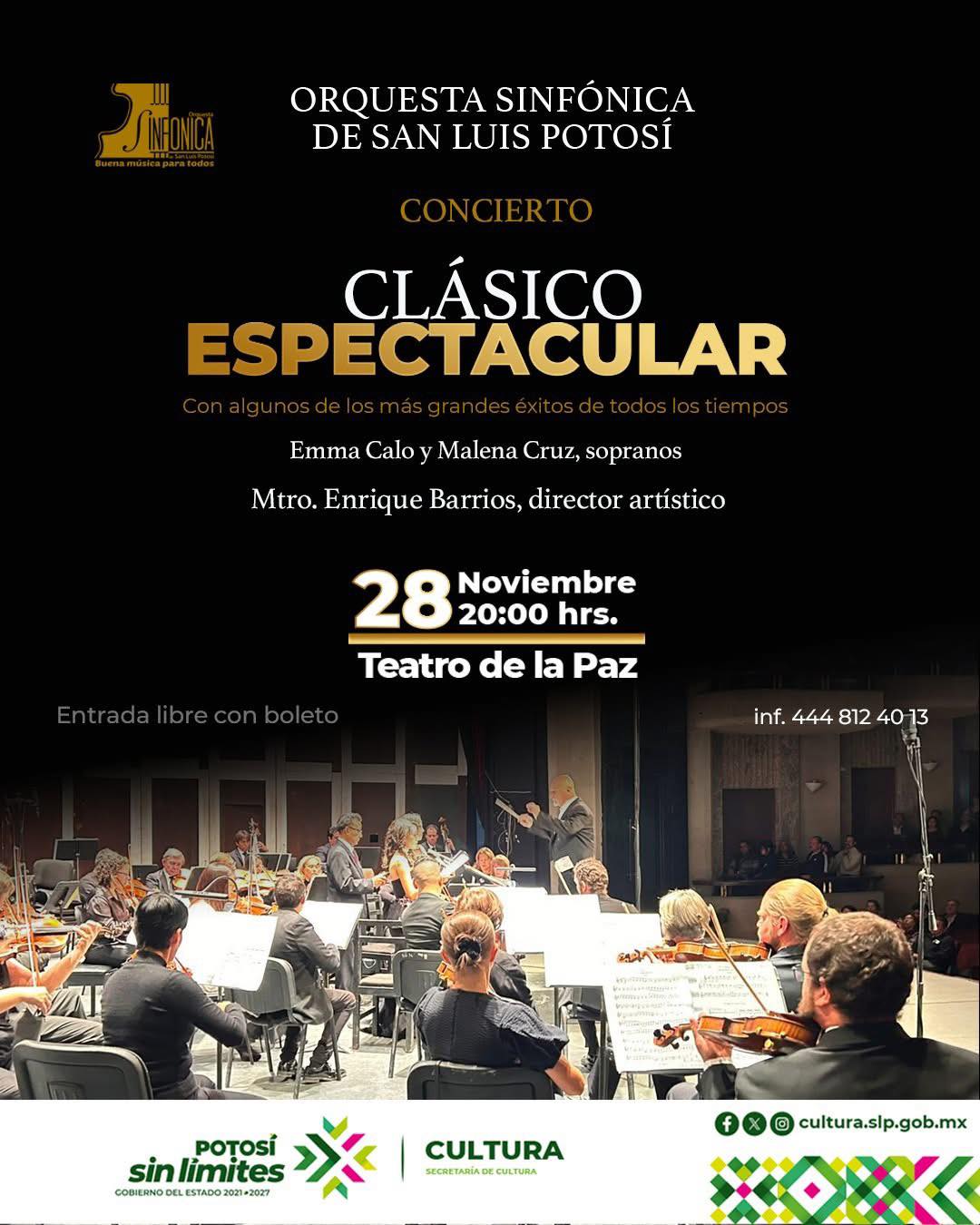Esta noche, la Orquesta Sinfónica de San Luis Potosí (OSSLP) ofrecerá su concierto “Clásico Espectacular” en el Teatro de la Paz, una presentación que reunirá algunos de los éxitos más reconocidos del repertorio sinfónico mundial. El evento, programado para las 20:00 horas, forma parte de la oferta cultural impulsada por la Secretaría de Cultura estatal.