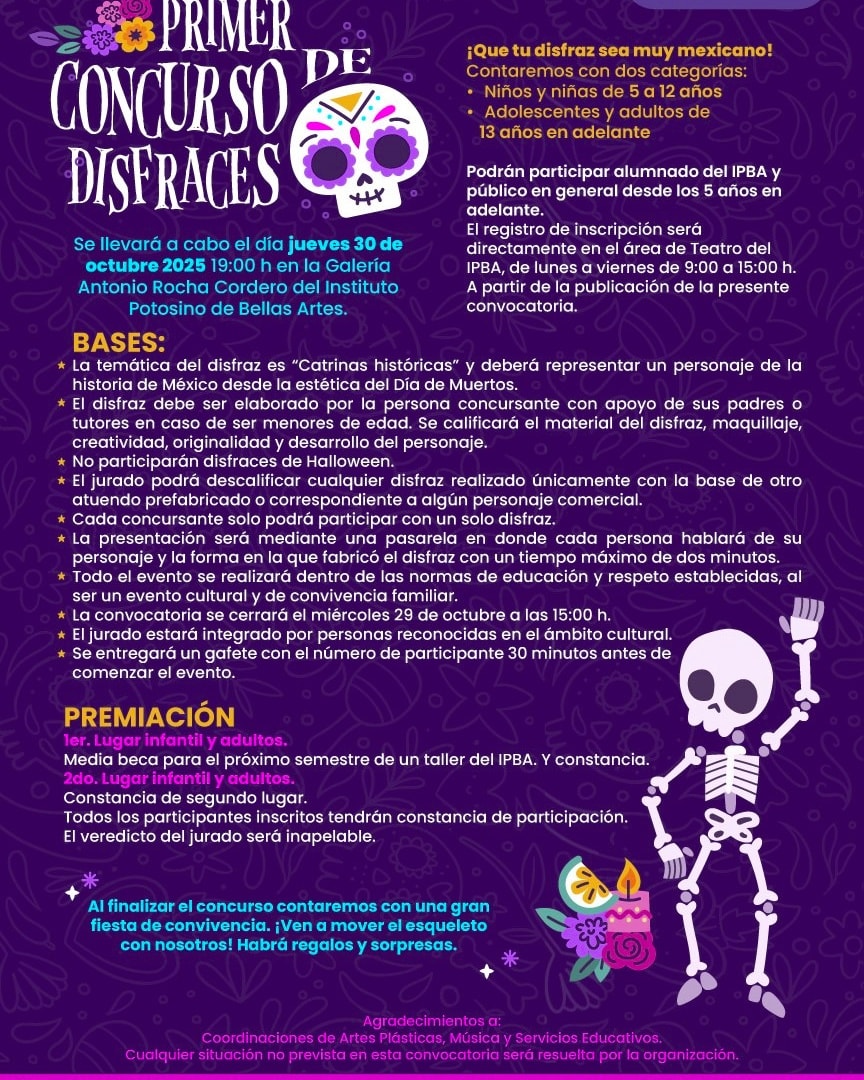 El Instituto Potosino de Bellas Artes (IPBA) invita al público a participar en el Primer Concurso de Disfraces, una actividad que busca celebrar las tradiciones mexicanas con creatividad, arte y comunidad.