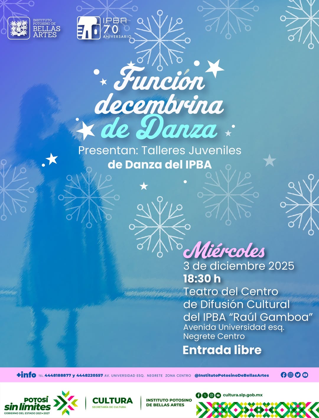 El Instituto Potosino de Bellas Artes (IPBA) invita al público en general a la Función Decembrina de Danza, una presentación especial en la que el alumnado de los talleres juveniles mostrará el trabajo desarrollado durante el año. La actividad se llevará a cabo este miércoles 3 de diciembre a las 18:30 horas en el Teatro del Centro de Difusión Cultural del IPBA “Raúl Gamboa”, ubicado en Av. Universidad esquina con Negrete, en el Centro Histórico de la ciudad. La entrada será completamente libre.