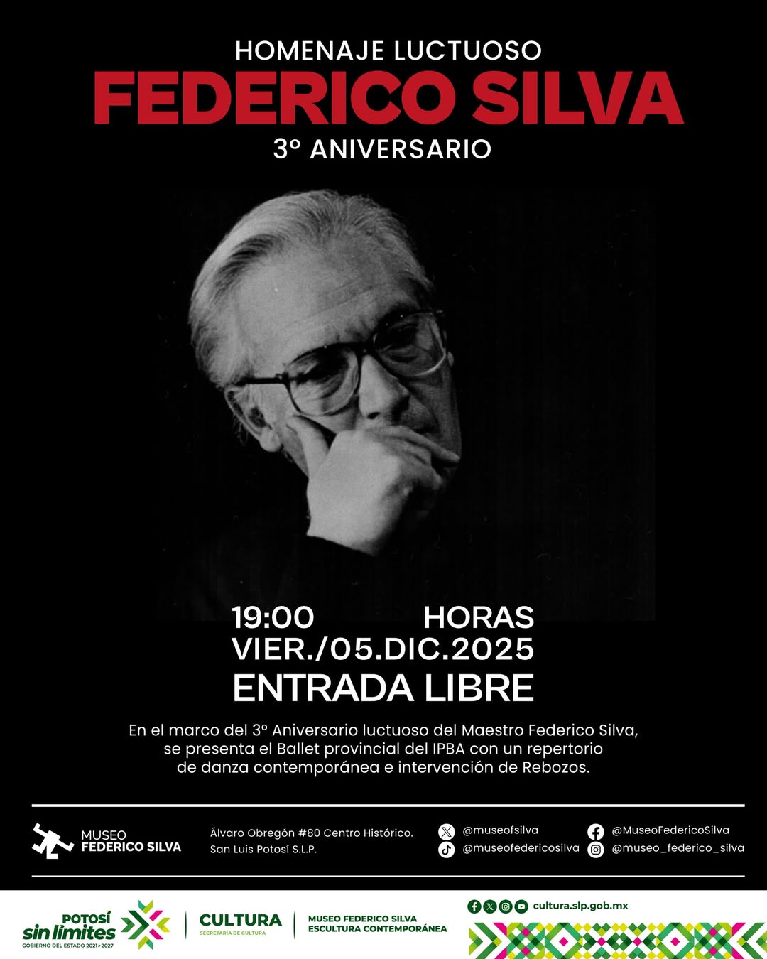 En conmemoración del tercer aniversario luctuoso del maestro Federico Silva, una de las figuras más destacadas de la escultura contemporánea en México, el Ballet Provincial del Instituto Potosino de Bellas Artes (IPBA) presentará un programa especial de danza contemporánea este viernes 5 de diciembre a las 19:00 horas, en el Museo Federico Silva. La entrada será libre para todo público.