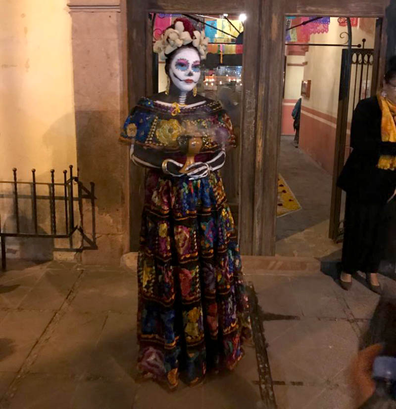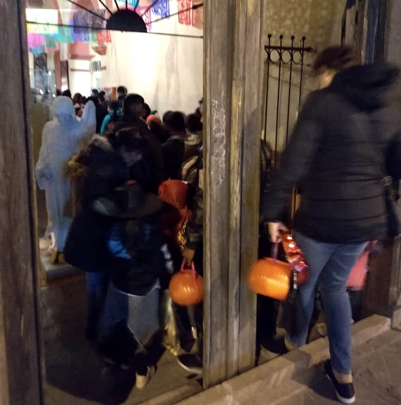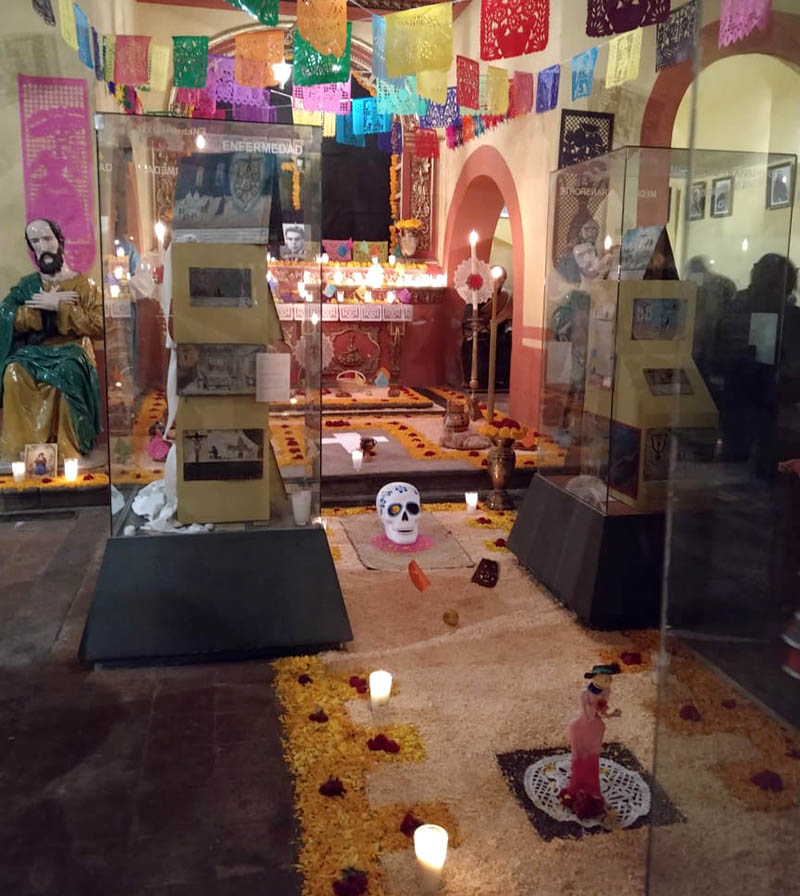 A pesar del frio de la noche en decenas hasta pasar de los seiscientos visitantes, entraron ordenadamente en fila al inmueble para apreciar y disfrutar de nuestra tradición mexicana: Altar de Muertos, en cuyo montaje se destacan la geometría en tapetes diseñados a base de aserrín y pétalos de la flor de los muertos cempasúchil, que hacían un camino hasta el altar, entre veladoras, velas y humo de copal, los asombrados visitantes veían como la luz tenue de la nave de la ermita y la que irradiaban los pábilos, creaban una atmósfera cálida y fraterna, pues observaban como entre las cazuelas de barro con alimentos, postres, jarras, canastas de frutas, banderas de papel picado, veladoras, figuras de catrinas, resaltaban las vitrinas de los exvotos y los textos populares de agradecimiento al Santo de la devoción de cada creyente por el favor recibido.