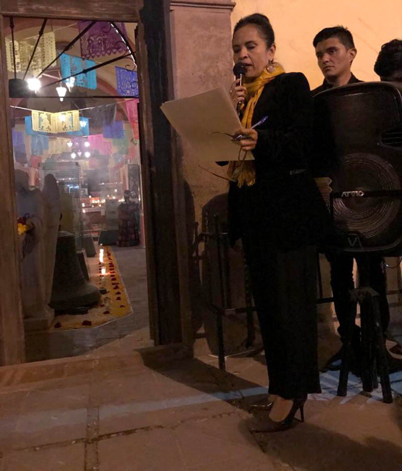 Creado y organizado de manera ciudadana el Museo de Exvotos del Saucito convocó al Colectivo Huexotl, Grupo Independiente Primer Viento y la Junta de Mejoras Saucito, para montar y presentar un singular y único Altar de Muertos, pasadas de las 19:00 Hrs., en la última noche octubre, los ciudadanos y vecinos de la zona norte de nuestra ciudad, congregados en torno a la portada de la antigua Ermita, construida en el populoso barrio El Saucito, escucharon las palabras de bienvenida de la Arq. María del Carmen Ramírez Ramos, que expreso: “Esta noche con la participación ciudadana y comunitaria estamos presentando este Altar de Muertos, en homenaje a Manuel López Servín, pionero promotor de las festividades en honor del Señor del Saucito, con el objetivo de rescatar y preservar nuestras sentidas tradiciones, a la vez difundir los valores humanos y religiosos, que en el homenaje a los muertos, fomentamos como memoria, ofrenda y sentido de pertenencia a nuestros antepasados y a nuestras familias y comunidad, con ello impulsaremos actividades y acciones que contribuyan a fomentar la identidad cultural y la convivencia social de los habitantes y vecinos del barrio del Saucito, con la finalidad de que vayamos fomentando los preparativos que conmemorarán los 200 años de la fundación de este ancestral barrio del Saucito.”