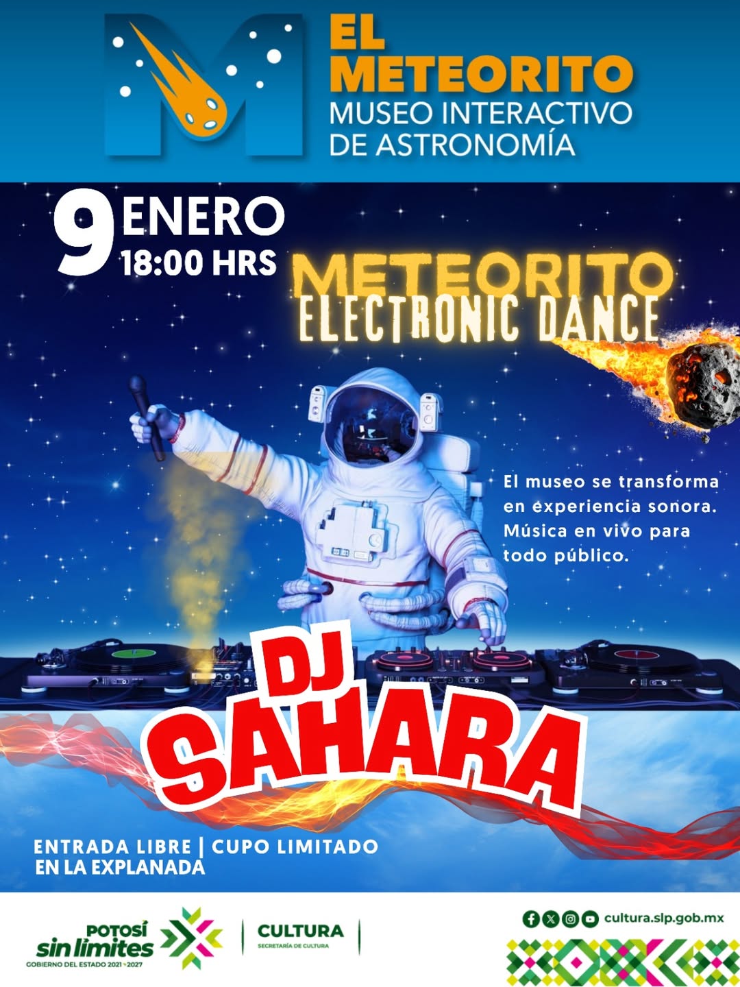 Este viernes 9 de enero, a partir de las 18:00 horas, el recinto será sede de la presentación de la DJ SAHARA, acompañada del proyecto Meteorito Electronic Dance, una experiencia sonora que busca acercar nuevas expresiones musicales a públicos de todas las edades en un entorno cultural y recreativo.