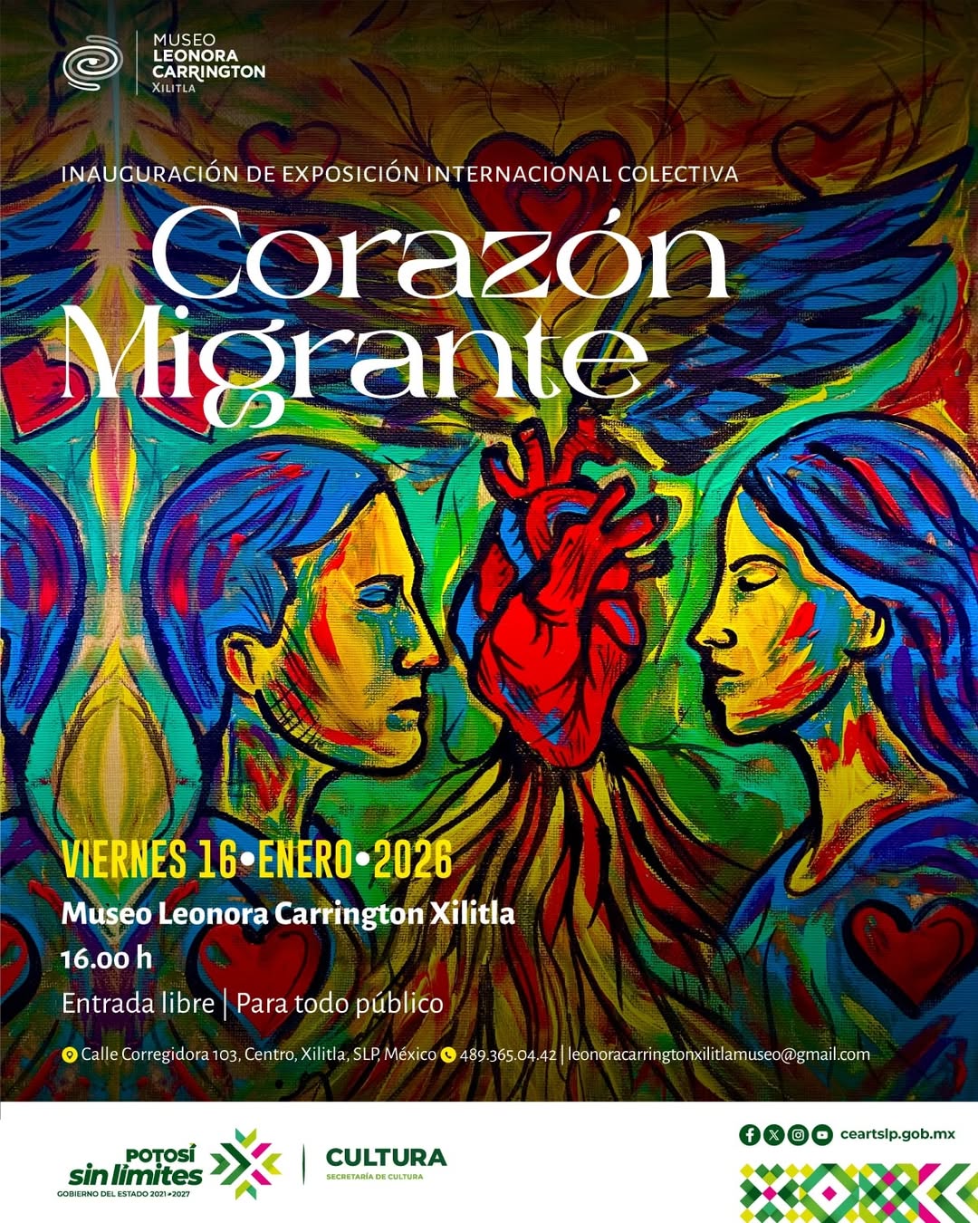 El Museo Leonora Carrington Xilitla inaugurará este viernes 16 de enero de 2026, a las 16:00 horas, la exposición colectiva internacional “Corazón Migrante”, una propuesta artística que reflexiona sobre las crisis migratorias que definen a la sociedad contemporánea.