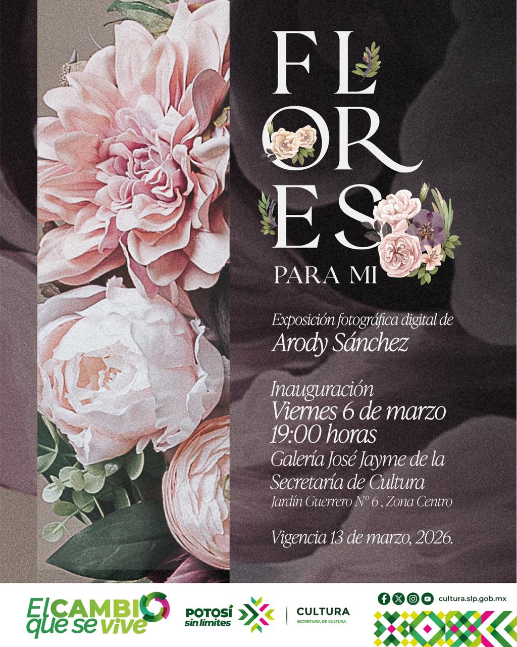 La Secretaría de Cultura de San Luis Potosí invita al público a la inauguración de la exposición fotográfica digital “Flores para mí”, del artista Arody Sánchez, que se llevará a cabo este viernes 6 de marzo a las 19:00 horas.
