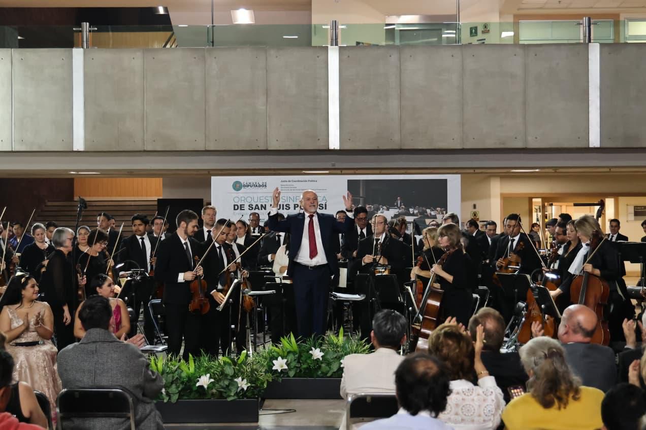 La Orquesta Sinfónica de San Luis Potosí brilló en su reciente presentación en la Cámara de Diputados de la LXVI Legislatura, donde participó con gran éxito en el ciclo cultural “Las Orquestas en los Estados”. Dirigida por el maestro Enrique Barrios González, la agrupación potosina fue ovacionada por las y los asistentes, consolidándose como una de las orquestas más destacadas de la escena nacional.