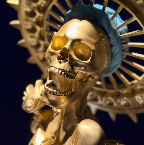 La exposición “Calavera mexicana. Símbolo de vida”, de la artista Perla Arroyo, propone una lectura contemporánea de los símbolos de la cosmovisión mexicana, entre ellos la pieza “Coyolxauhqui”, una obra que resignifica a la deidad mexica desde la idea del renacimiento y la fortaleza espiritual.