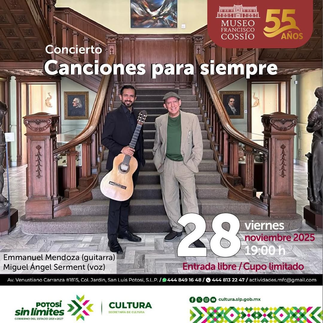Este viernes 28 de noviembre, el Museo Francisco Cossío abrirá sus puertas para recibir el recital “Canciones para Siempre”, un concierto íntimo que reunirá la guitarra de Emmanuel Mendoza y la voz de Miguel Ángel Serment, dos talentosos músicos que ofrecerán un recorrido emotivo por temas clásicos y contemporáneos.