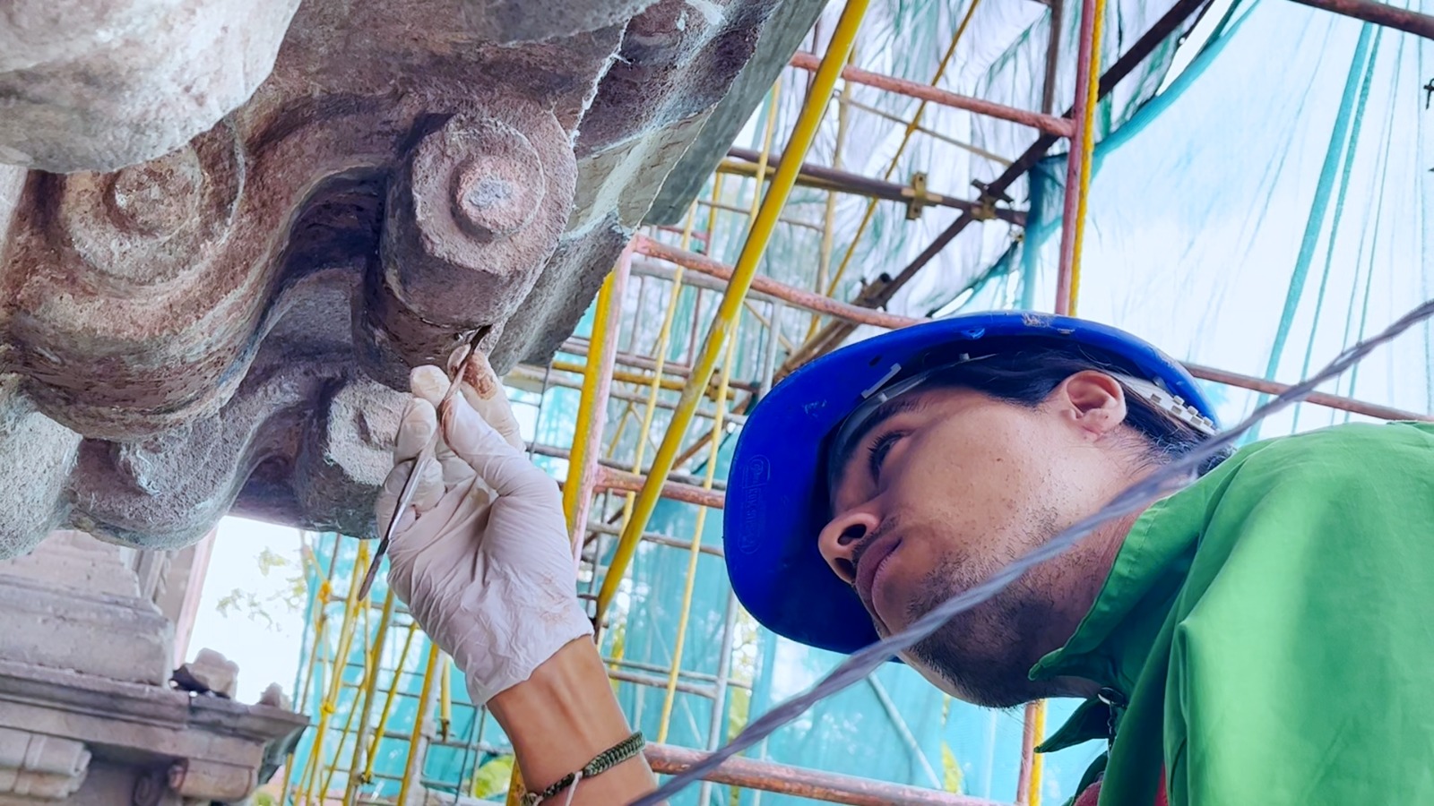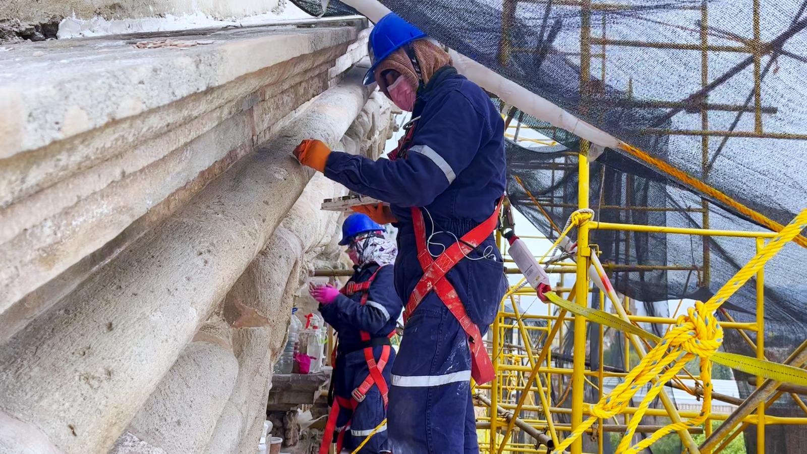 Israel Hernández, restaurador encargado de la portada, destacó que el trabajo de rejunteo y reintegración volumétrica permite devolver estabilidad y lectura estética a los elementos tallados en cantera, respetando su diseño original.
