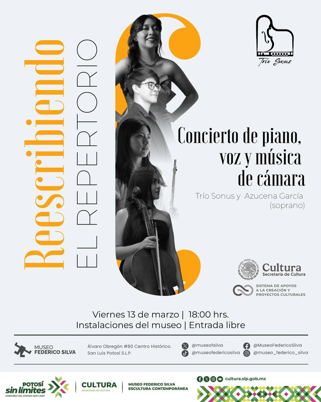 El ensamble potosino Trío Sonus y la soprano Azucena García ofrecerán el concierto “Reescribiendo el repertorio: ciclo de compositoras relegadas”, el próximo viernes 13 de marzo a las 18:00 horas en el Museo Federico Silva Escultura Contemporánea.