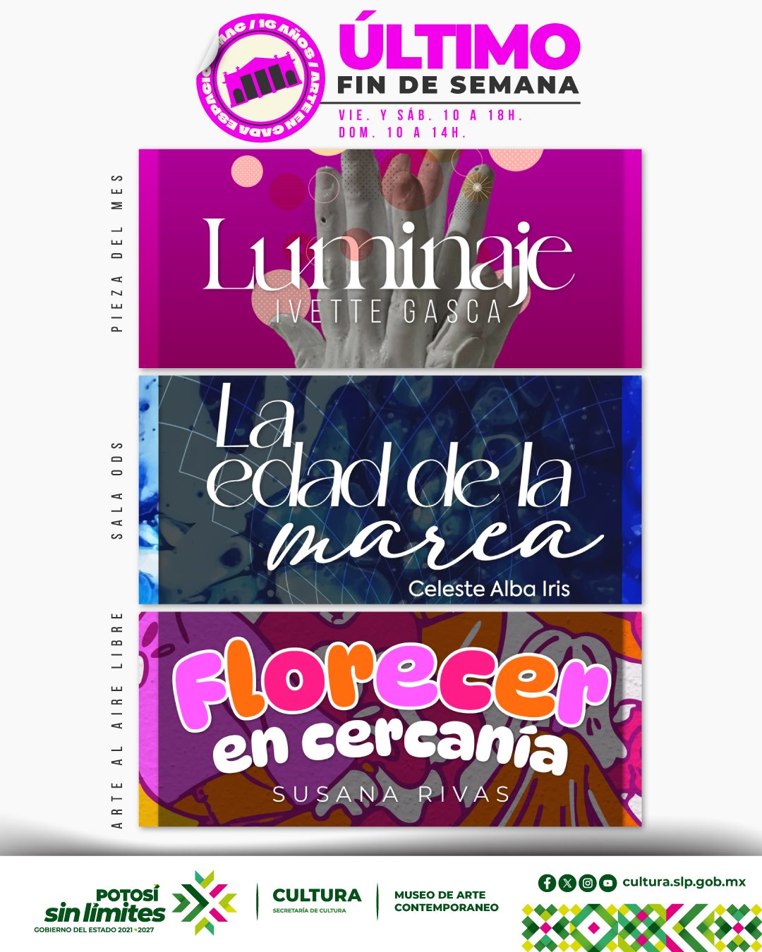 Las muestras que cierran temporada son “Luminaje”, de Ivette Gasca; “La edad de la marea”, de Celeste Alba Iris; y “Florecer en cercanía”, de Susana Rivas, cada una con una mirada particular que invita a la reflexión y a la experiencia estética desde distintos lenguajes contemporáneos.